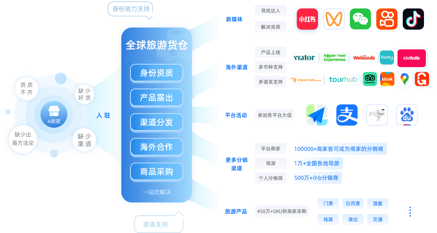 汇集全球海量旅游商品、OTA渠道、B2B平台及社媒达人等资源,通过技术直连及人工服务,为商家解决不同平台需要的身份、产品露出、渠道撮合、热门产品采购、资金结算、多语言运营、多语言客服等需求。